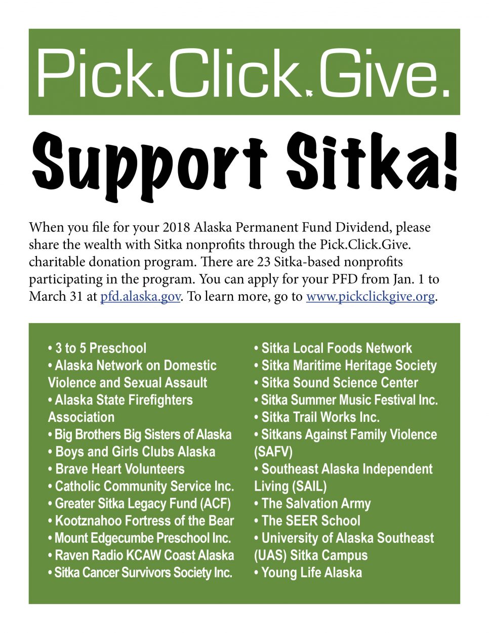 Charles Bingham and Julia Smith are local volunteers for Pick, Click, Give, a statewide campaign to allow Alaskans to donate a portion of their Permanent Fund dividend to nonprofits and charities. In 2017 Alaskans donated $2.5 million to causes that matter to them — over $100,000 in Sitka alone. Twenty three Sitka-based non-profits are participating in the program. Learn more about local organizations involved in Pick, Click, Give here.