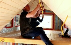 Sitka High senior Jackson McGraw stretches a measuring tape for fellow senior Kyler Sumauang along the ridge of the tiny home. (KCAW photo/Robert Woolsey)