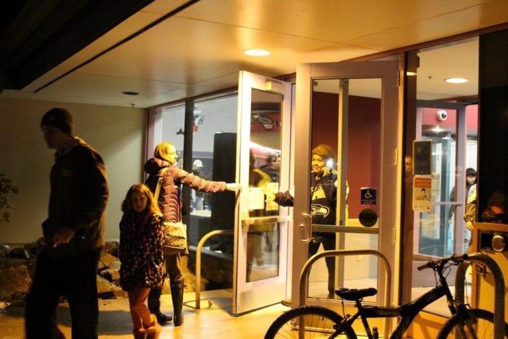 Doors open at Keet Gooshi Heen Elementary School in Sitka, as the city issues the “all clear” and residents are permitted to return to their home early Tuesday morning. (Emily Kwong/KCAW photo)