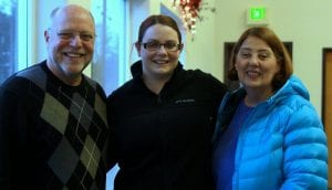 Indea Ford with McArthur, and church secretary Betty Jo Moore. Ford has found a peace living in Sitka that she had never really experienced before, and her daughters are thriving. Even if she’s forced to return to the UK she’ll try to ensure that her girls remain in the US with Kenny. “I do not want them subject to that abuse again — ever,” she says. (KCAW photo/Robert Woolsey)