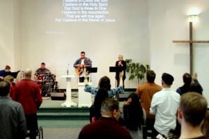 Grace Harbor Church is probably one of Sitka’s largest. It’s a bright space, with windows overlooking the wide expanse of Sitka Sound. A contemporary Evangelical congregation is led by a rock band, with lyrics projected on the gleaming white walls.