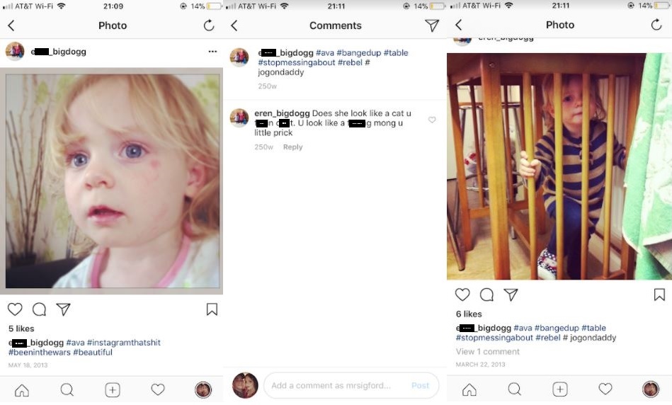 Among Ford’s evidence documenting an alleged pattern of abuse by her daughters’ biological father are these Instagram posts, where he apparently boasts about their battered appearance. Of Ava, clearly bruised, he writes “#beeninthewars,” along with other much cruder language. Ford made an appeal in May, 2015, to emigrate legally with the girls to Alaska, but it was dismissed by the Dartford Family Court. (Images provided)