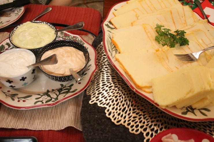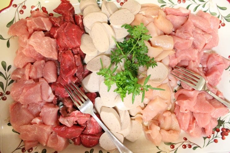 We pass around a white ceramic plate piled high with raw meats, chicken, pork, beef, sausages, bacon and, not-so-traditionally, shrimp, her daughter’s favorite. Another plate of Swiss cheese Jeanette brought from home and locally bought Muenster cheese circulates around the table.