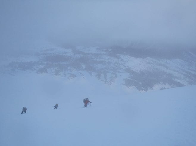 “By the time we hit the last post we were already sucked way in, and the visibility was pretty bad and it started blowing pretty hard,” Sorokin said. “Not too long after that snow started falling. We saw the pillar of rocks that is up at the top past the last post. We made the decision to lean to the left, thinking we’d end up in the crater. Somehow ended up doing the opposite, leaning to the right.”