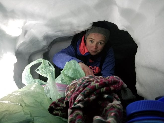 “We had cell phone service the entire time in our snow cave,” Kruse said, laughing. “I think we all sent out ‘Hey, we’re all snug in our snow cave’ messages. Weather conditions aren’t what we hoped for so we just tuckered in for the night.”