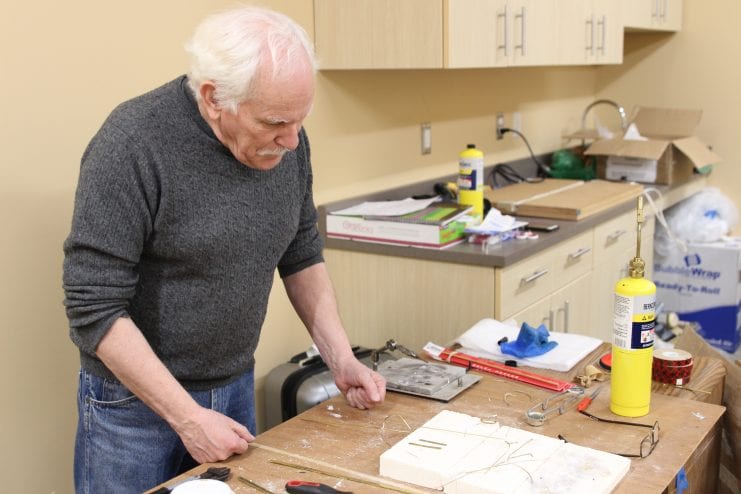 Tom Bennett works on a mount for a small exhibit. Bennett, a curator at the Alaska Heritage Museum in Anchorage, traveled to Sitka for three days to teach volunteers how to properly build mounts for various exhibits in the museum. (Photo/KCAW/Katherine Rose)