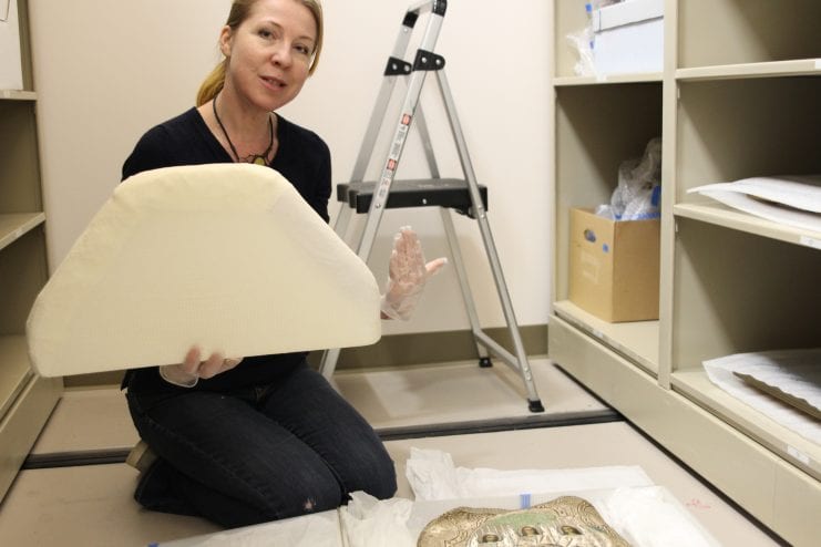 Anichenko shows a form made by a volunteer that will support the robe on display (Photo/KCAW/Katherine Rose)
