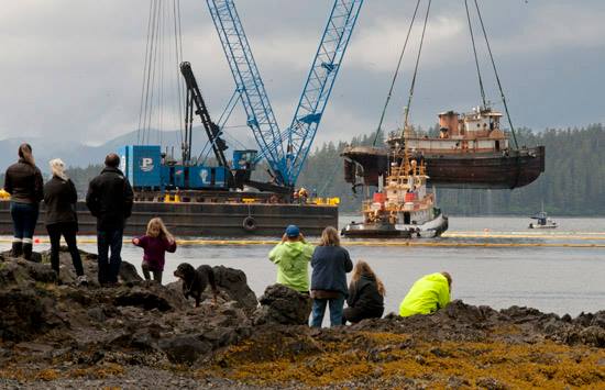 RISE AGAIN – Sitkans watch from shore as the tug Powhatan is hauled up near Old Sitka. The 85-foot tug sank April 19 at the dock. (Sentinel Photo by James Poulson)