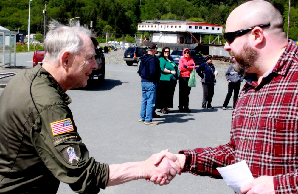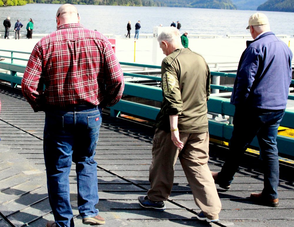 A walk worth the wait: Sitka Economic Development Association Garry White (l.) and board member Roger Hames (r.) accompany Gary Paxton down the ramp to the park’s new 250-foot floating dock. Paxton was municipal administrator in the mid-1990s, when the city acquired the former site of the Alaska Pulp Corporation Mill to repurpose as an industrial park. (KCAW photo/Robert Woolsey)