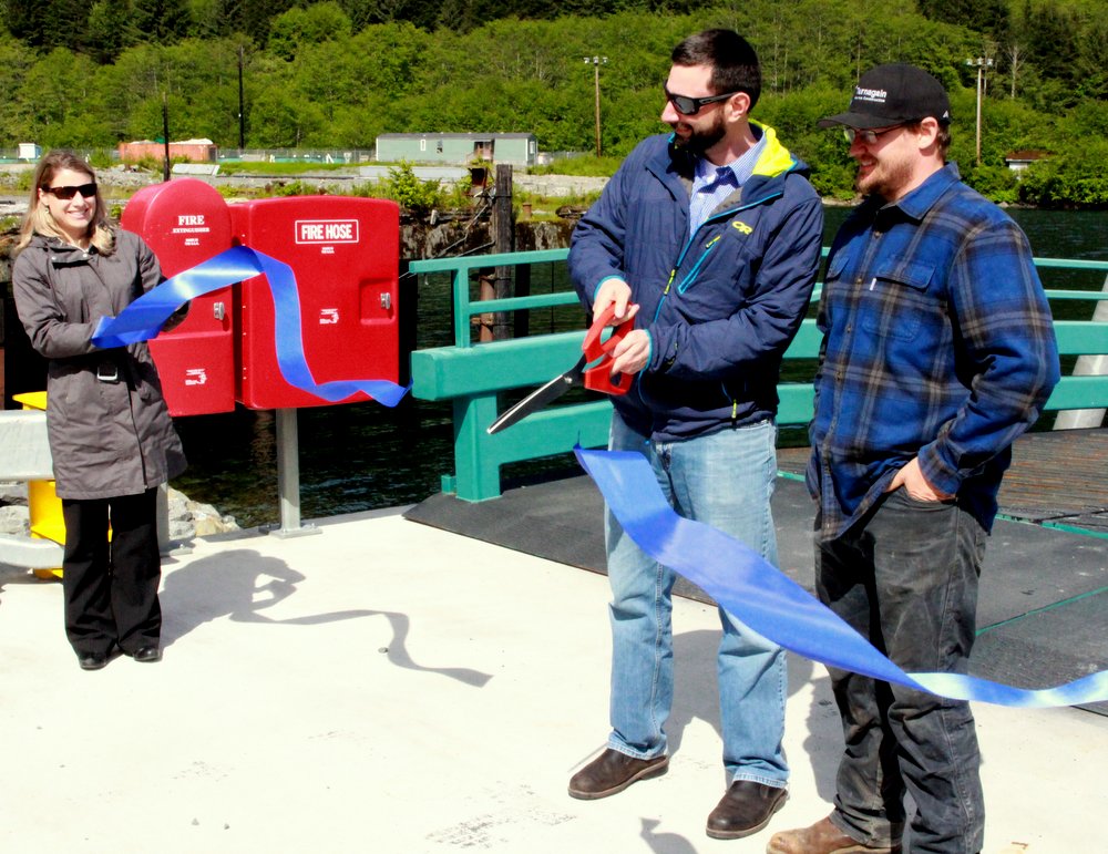 Board members of both the Sitka Economic Development Association and the Gary Paxton Industrial Park gathered with the public Thursday afternoon (5-31-18) to cut the ribbon on the park’s latest facility, a huge floating dock.