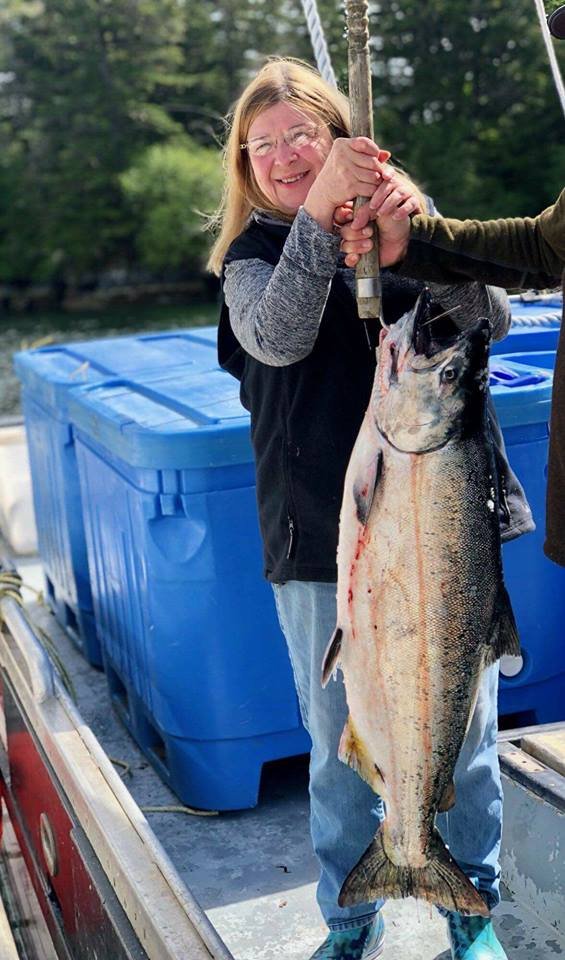 A three-time champion, Baggen landed this 33.6-pounder on Saturday (6-2-18). Still it’s a minnow compared to her past winners of 48 pounds (2000) and 56 pounds (2009). (Sitka Salmon Derby photo)