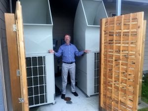 Paul Voelkers, with MRV Architects in Juneau, shows the two air-source heat pumps which warm the library’s floor by extracting heat from the outside air. “This used to be where the fuel tanks were,” he says. “Now there’s this Japanese screen.” (KCAW photo/Robert Woolsey)