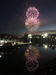 Fireworks near ANB Harbor on Tuesday, July 3, 2018. Because of long summer daylight, Sitka’s main fireworks show goes off at 11:30 p.m. on the 3rd. During festivities on the 4th, everything from freedom to WWII Japanese internment camps was on the minds of Sitkans. (KCAW photo/Rachel Cassandra)