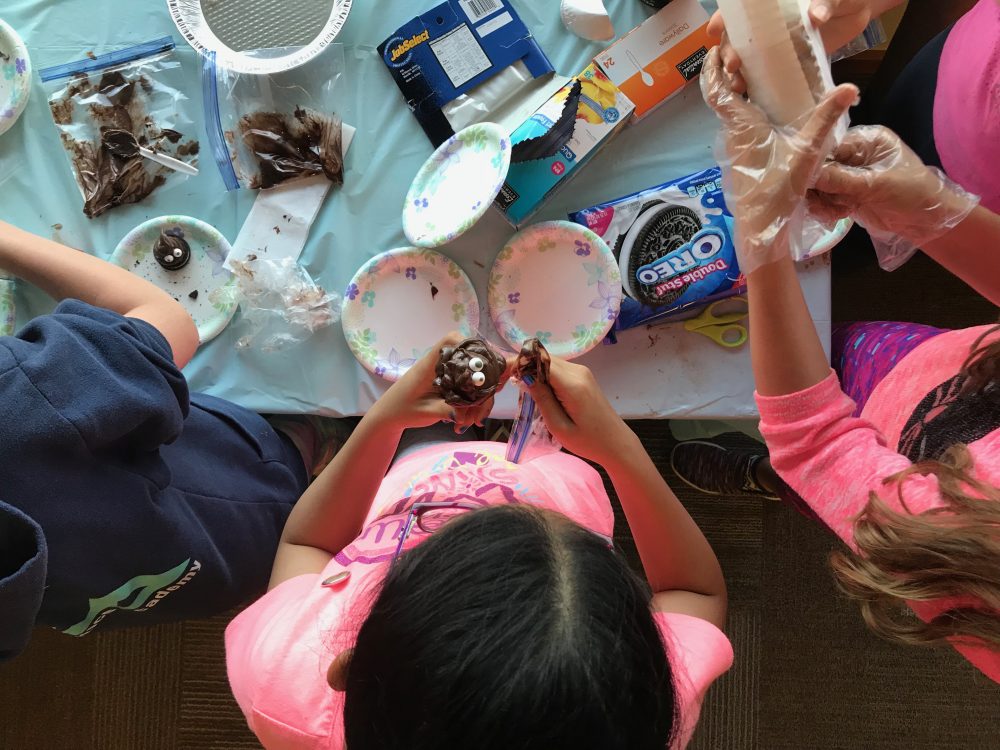 That’s Lydia Pierce. The kids are making emoji coasters out of the plastic beads and poop emojis out of icing squeezed into a spiral. There are, of course, a million jokes. Can we eat our poop now?