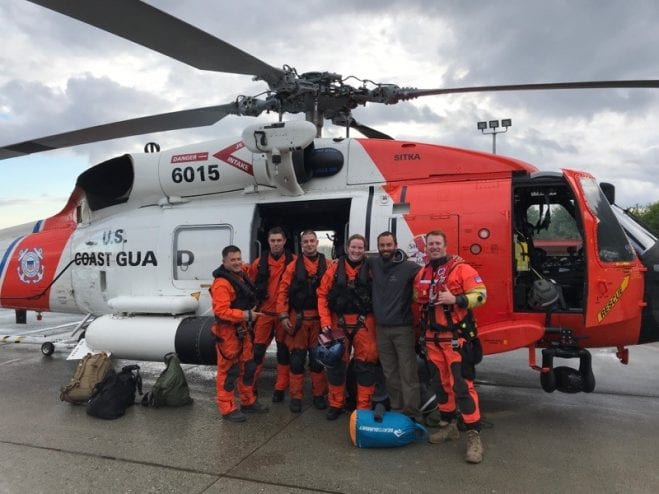 The plane crash survivor, Alec Wildenstein, and crew of the MH-60 Jayhawk helicopter arrive in Sitka after a successful rescue. From left are Lt. Cmdr. Joseph Plunkett, Lt. Douglas Eberly, flight mechanic Mark Newkirk, flight surgeon Cmdr. Kjersti Koskinen, Wildenstein and rescue swimmer Tyler Sojka. (Photo provided by the U.S.C.G.)