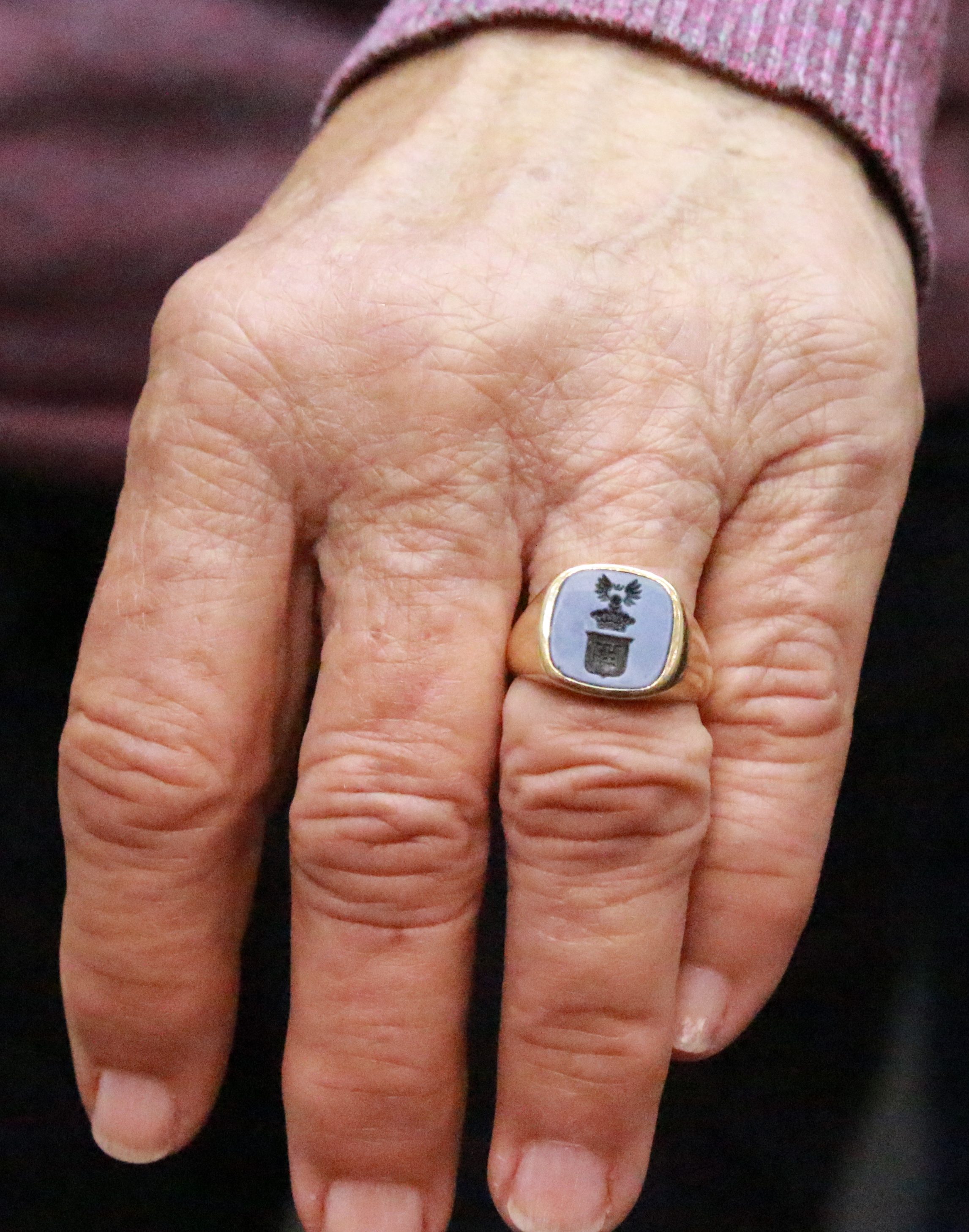 Carola Von Wrangel’s signet ring bearing the family crest. The ring is more a reminder of family than of empire. (KCAW photo/Robert Woolsey)