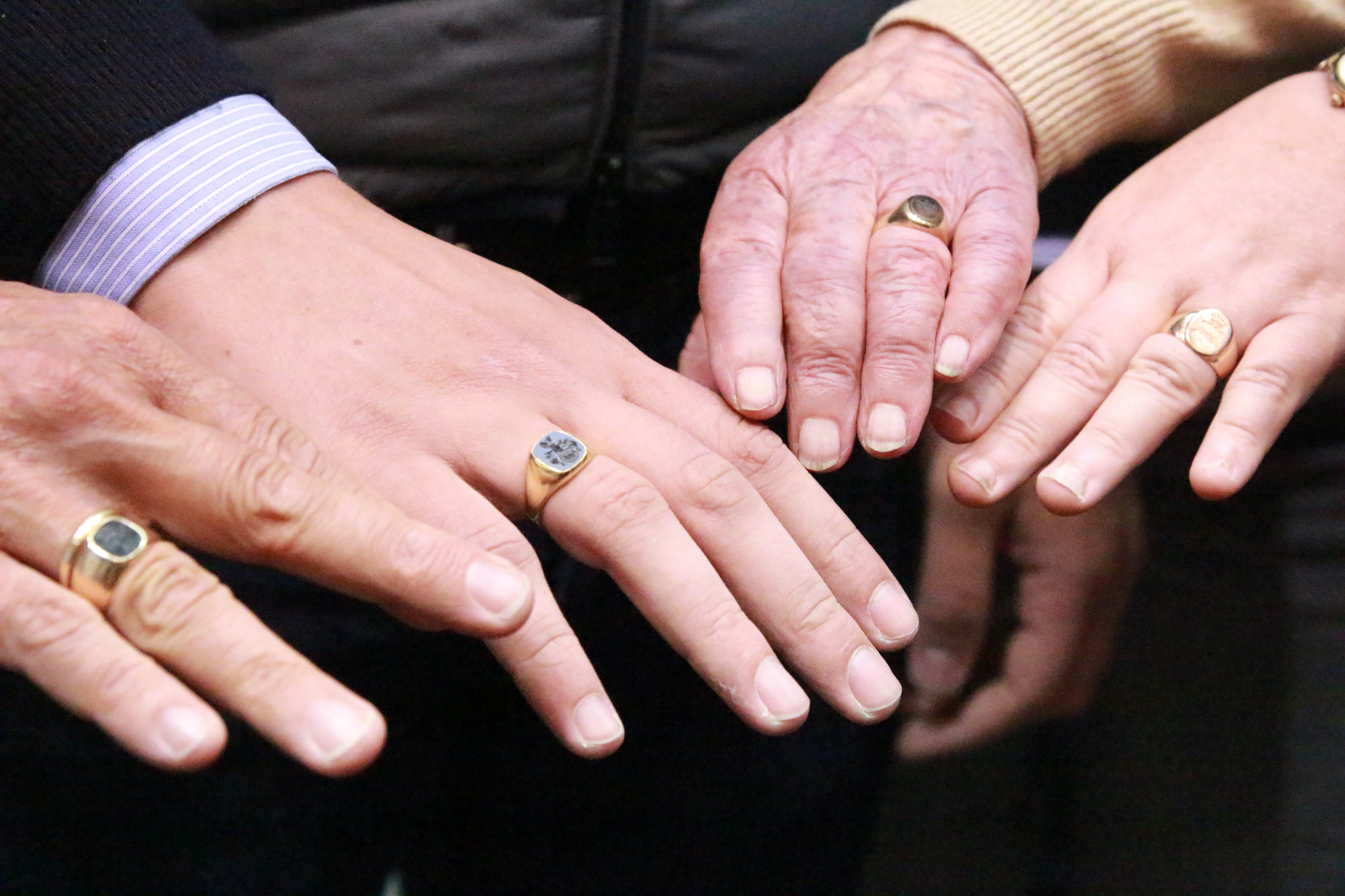 There are around 80 descendants of the Baron Ferdinand von Wrangel — mostly in Europe. While there’s no secret handshake, according to trip organizer Cornelia Von Wrangel, there is a ring with the family crest. All 14 family members visiting Sitka wear one. (KCAW photo/Robert Woolsey)