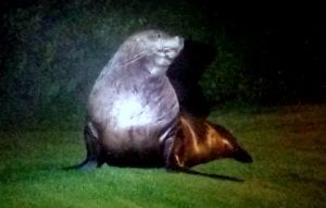 How to phone home? The Steller’s sea lion eventually took refuge in the brush off of Tongass Drive. Authorities don’t want the animal disturbed; rather, once it calms down, they believe the sea lion will return to the water. (Eric Raznuikinas photo)