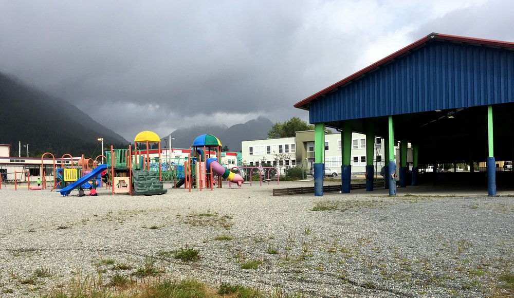 “The gravel is a problem,” one parent told the Sitka School Board on Wednesday. She was talking about the surface of the Baranof Elementary playground. The shelter pictured at right is the former maintenance building; the district is considering making similar modifications on the shelter at Keet Gooshi Heen — but only as a temporary measure. (KCAW photo/Robert Woolsey)