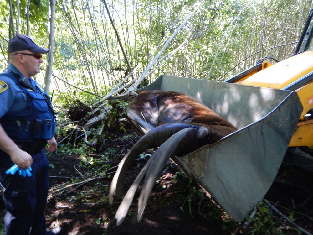 NOAA law enforcement lifts the sea lion, after he’s been sedated in a stand of alders, with a front loader donated by SEARHC. (Photo courtesy of NOAA)