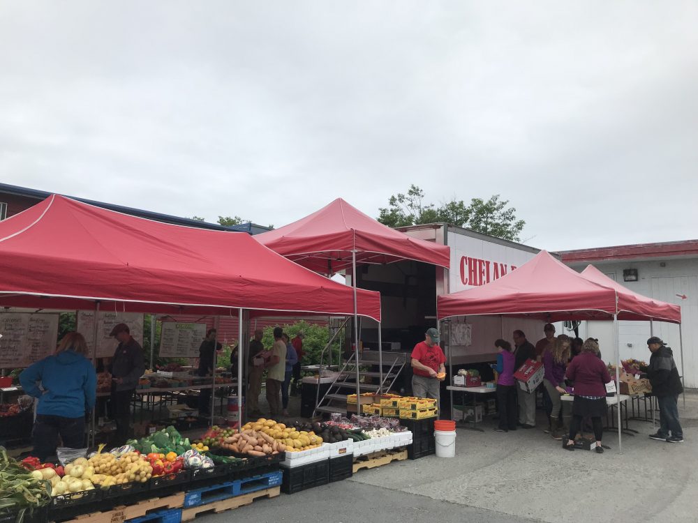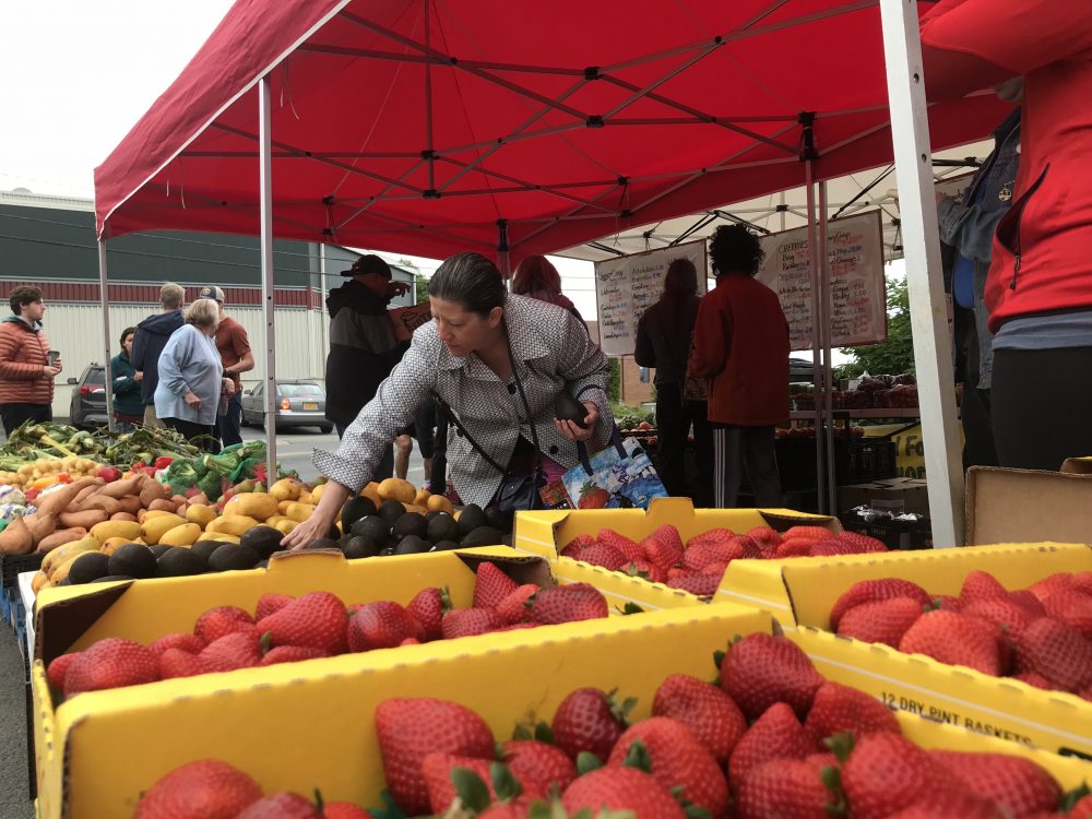 Chelan Produce Co. has been in business since 1978, when owner Dave Kensinger got stuck with a truckload of apples in Seattle and hopped the ferry to sell in Juneau. Customers around Southast have been loyal ever since. He and his wife Mona Christian now sell exclusively in Sitka and Petersburg on alternating weekends. Martha Pearson shops at Chelan’s mid-July market, a peak time for berries, apricots, peaches, and plums. (Emily Kwong/KCAW photo)