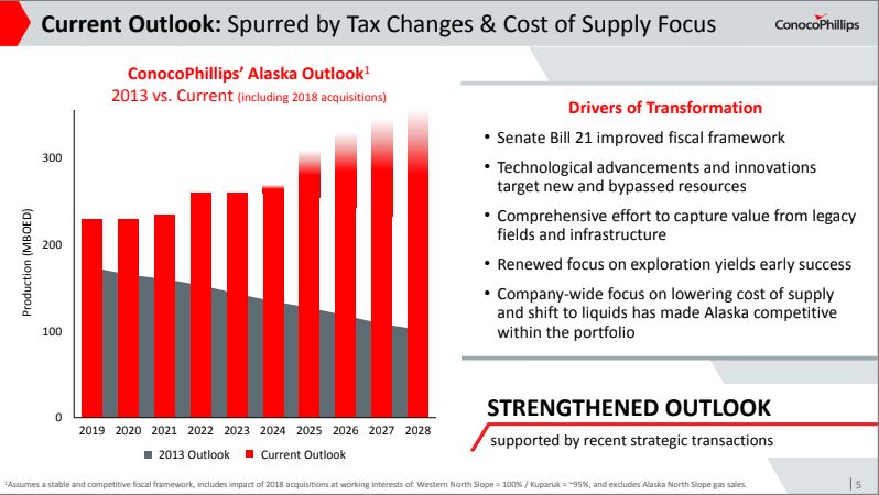Jepsen contrasted his company’s projections for 2013 (for production, in gray) again this year’s more optimistic trend (in red). Jepsen cited numerous reasons for the reversal, including Alaska’s controversial oil tax overhaul in 2014, known as SB 21. (ConocoPhillips image)
