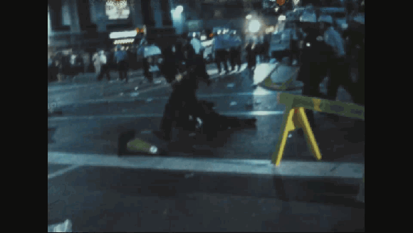 Dzugan – It was walking out of the car into a riot, basically. And it was out of control on both sides. So I saw a side street and immediately ran down it to get out of the main street — I just wanted out of there. I remember being by myself and seeing a uniformed police officer with all the riot gear come out of an alleyway and tell me to stop. So I stopped. And he ran over to me, and what I vividly remember is the hatred in his eyes. This was a man not much older than me — maybe in his early twenties — and he was very angry about something. I don’t know what happened to him previously. But I figured that the safest thing to do was to do what he says. So I stopped and he grabbed me and started beating me with billy club. And the image I had of that was, “This is what it’s like to be in warfare, when you have the enemy in your grasp, in your eyes, and you want nothing more than to do damage.”