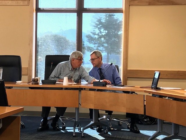 Lt. Gov. Byron Mallott (l.) confers with special assistant Scott Meriweather, at a Ballot Measure 1 hearing in Sitka Friday morning (9-21-18). Mallott told the audience that he felt obligated to hold a hearing in Sitka. The community has been the epicenter of salmon activism — primarily from the troll fleet — this year. (KCAW photo/Erin Slomski-Pritz)