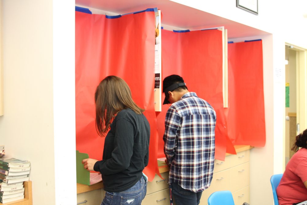 Students in Howard Wayne’s period 7 American government class cast their vote. The ballot is a sample version of the local municipal ballot. (Emily Kwong/KCAW photo)