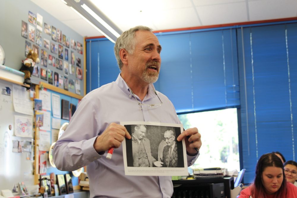 Tallying the students scores is someone who sat in this very classroom before. Owen Fulton took Mr. Wayne’s class in 2014. Now, he’s a student teacher. Fulton said the students can not only handle the work, but are honestly curious about how it connects to contemporary politics.