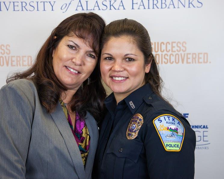 Mary Ferguson pictured next to her sister, Camille Ferguson, during the UAF Community and Technical College Law Enforcement Academy Graduation Ceremony in 2015. Ferguson has working with the Sitka Police Department as a sworn-in officer since 2015. (Photo from Mary Ferguson vs. City of Sitka Facebook page)