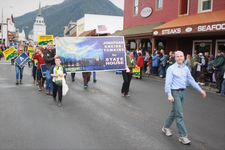 Democratic incumbent Jonathan Kreiss-Tomkins, pictured above participating in the Alaska Day Parade in Sitka, leads Republican challenger Richard Wein by almost 670 votes with 85 percent of precincts reporting as of 3 p.m. Thursday, Nov. 8. (Photo by Enrique Pérez de la Rosa, KCAW)