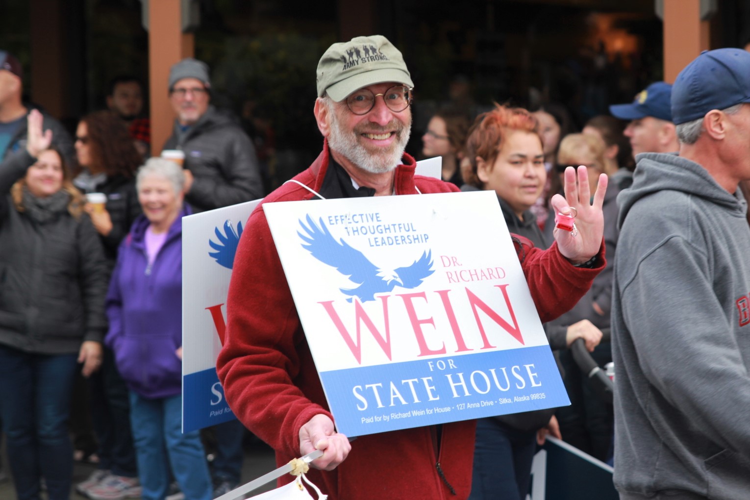 Republican challenger Richard Wein, pictured above on the campaign trail in the Alaska Day Parade in Sitka, ran against incumbent Democrat Jonathan Kreiss-Tomkins. (Photo by Enrique Pérez de la Rosa)