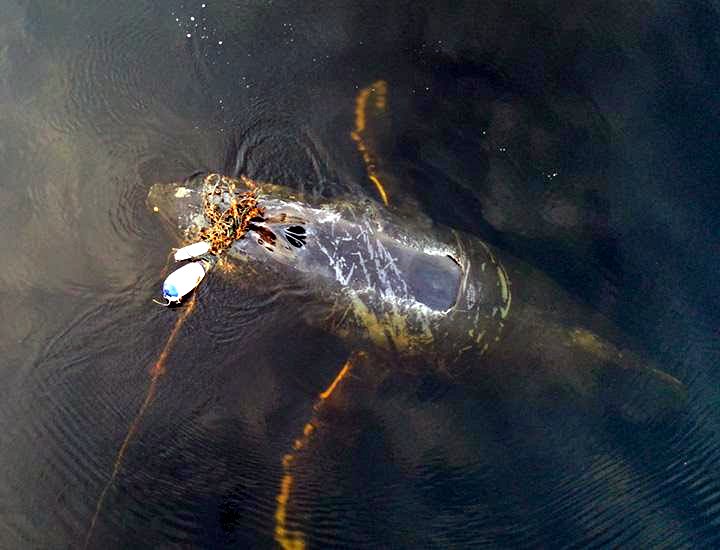 The sub-adult whale was entangled around the upper jaw in heavy gauge lines used for mooring docks. There were two buoys in the entangled lines, and a dense snarl of smaller lines about the size of an ice chest.