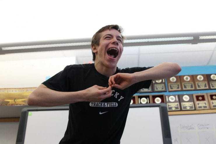 Sitka High DDF member Joe Pate performs in HI (Humorous Interpretation) in a regional meet last year. (KCAW photo/Emily Kwong)