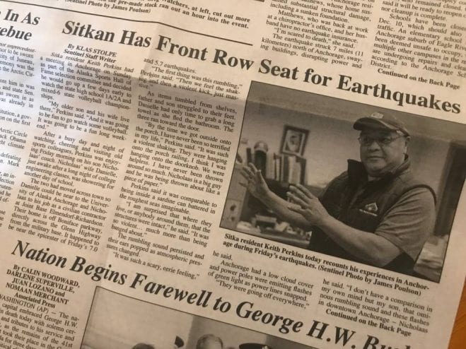 Klas Stolpe with the Daily Sitka Sentinel talks with Sitka resident Keith Perkins about riding out Friday’s earthquake (11-30-18) in Anchorage. The sports official had a meeting in Anchorage on Sunday (12-02-18) as part of the Alaska Sports Hall of Fame selection committee. He decided he would go up a few days early to watch the state high school 1A/2A and mixed-6 state volleyball championships.