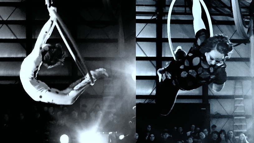 Marley Richards (l.) and Heylie Heck are two of the dozen aerial artists who performed in Sitka Cirque’s Winter Showcase on Saturday (12-16-18). Students choreographed their own pieces for the lyra (shown), trapeze, and silks. (Lois Verbaan photos)