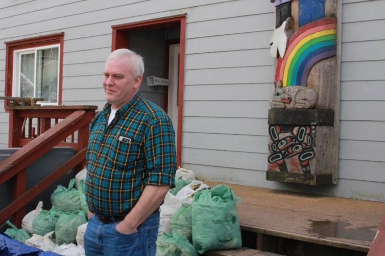Jeff Feldpausch stands in front of bags of hemlock branches, ready for distribution to elders. He noted the bare spots on the branches, illustrating the annual need for subsistence coming up short (Photo/KCAW Emily Kwong)