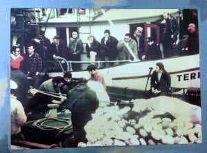 Herring seiners gather at the Sitka Sound Seafoods dock c. 1975 to assess the size of herring and the quality of the roe. Many pictured here were the original permit owners when the fishery went into limited entry. The author’s father, Leonard Skeek, is standing just to the left of the ladder. (photo courtesy Chuck Skeek)