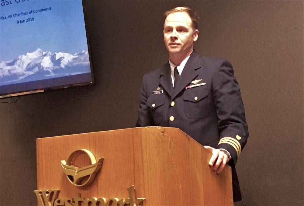 If people are on edge at the Air Station during the shutdown, Cmdr. Michael Frawley is giving nothing away. “I hope I’m paid for today,” he told the Sitka Chamber, “but it’s always been ‘work first, get paid later’ (in the military).” The next payday for the Coast Guard is January 15. The Department of Homeland Security — which includes the Coast Guard — is among the agencies that President Trump is refusing to fund in his dispute with Congress. (KCAW photo/Robert Woolsey)