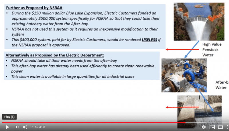 “The NSRAA proposed 20 cfs (cubic feet per second) system will cause an annual new automatic rate increase to electric customers of up to 1.2 million dollars per year, a 7 percent rate increase, due to diesel generation, when and if the following conditions occur.”