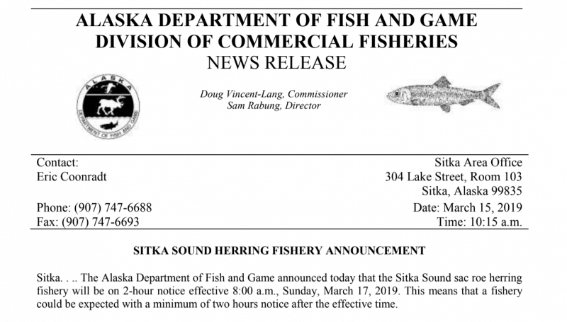 The Sitka Sound sac roe herring fishery will go on two-hour notice effective 8 a.m. Sunday, March 17. That means a fishery could open as early as 10 a.m. Sunday morning.