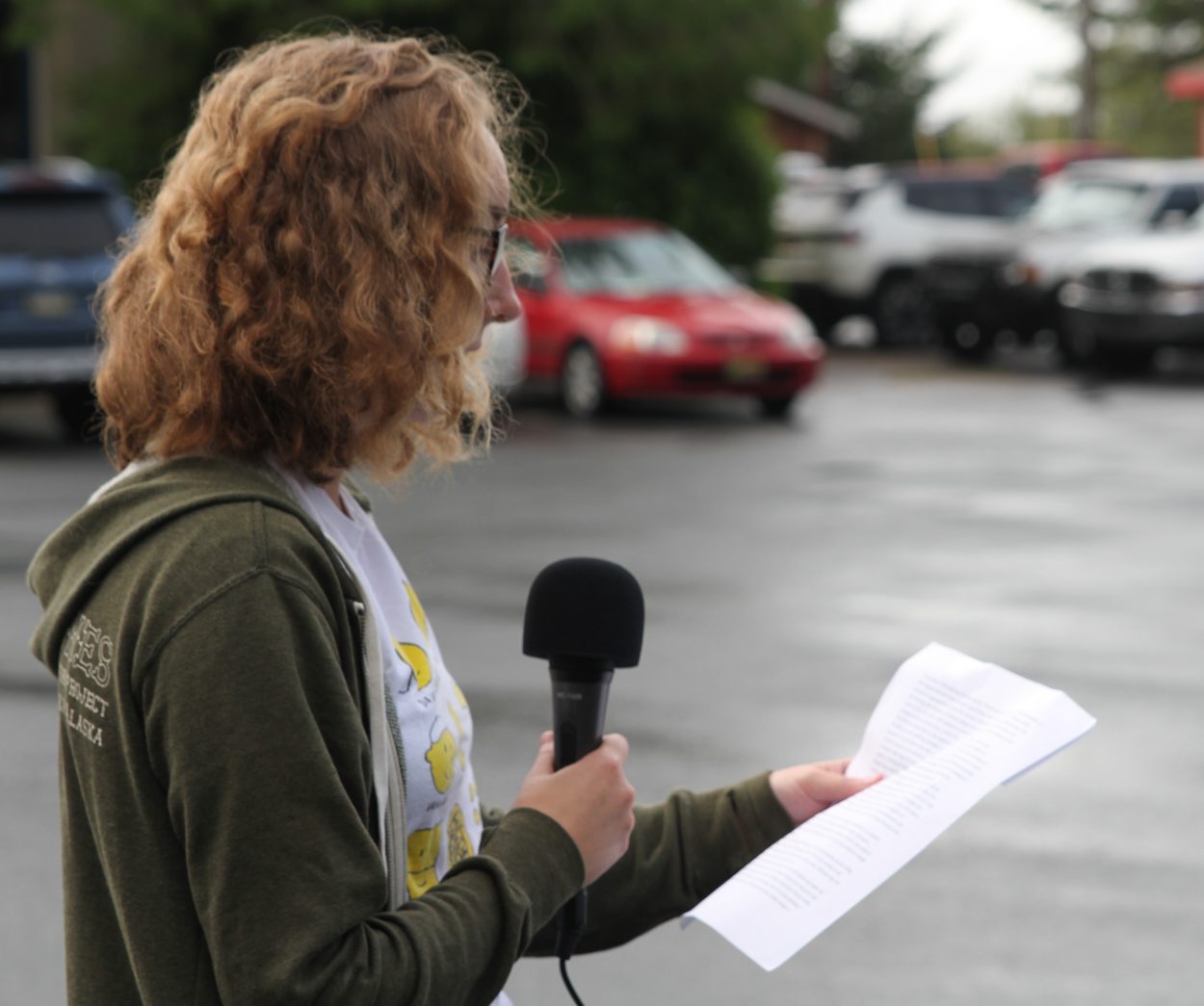 That’s Sitka High senior Cora Dow, rallying some 200 of her classmates — and about another 50 adult Sitkans in the back parking lot of the school.