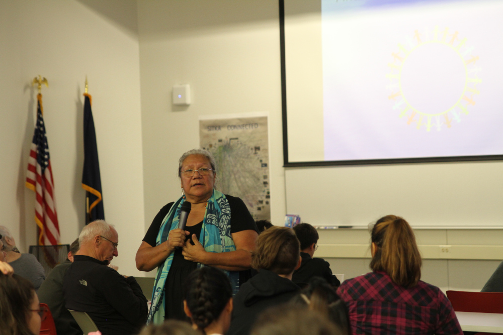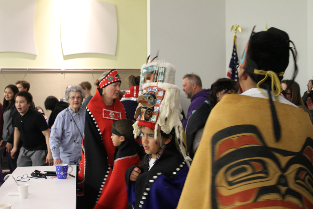 On the evening of Indigenous Peoples Day (10-14-19), a large crowd gathers at the Sitka campus of the University of Alaska Southeast. The event draws a diverse group: Native and non-Native, young and old, longtime local residents and seasonal workers. The organizers have lined up a full slate of activities: speeches, dancing, workshops. But first, a potluck dinner.