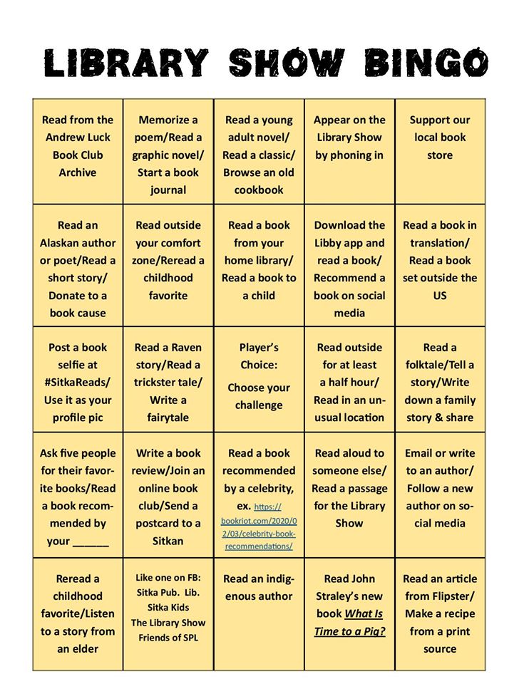 Hunkering Down for many Sitkans means endless Netflix, but there is an alternative: KCAW’s The Library Show is starting “Library BINGO.” Five-in-a-row wins an Elizabeth Peratrovich coin. A “coverall” wins a giant Nutella cake baked by Library Show host Kari Sagel. Visit the show’s Facebook page for more details.