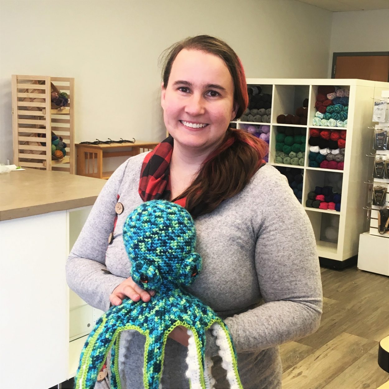 Leslie Dupuis holds up an octopus that she made. She started making stuffed animals for her daughter and then decided to start selling them. The craft is called Amigurumi. (KCAW photo/Erin McKinstry)