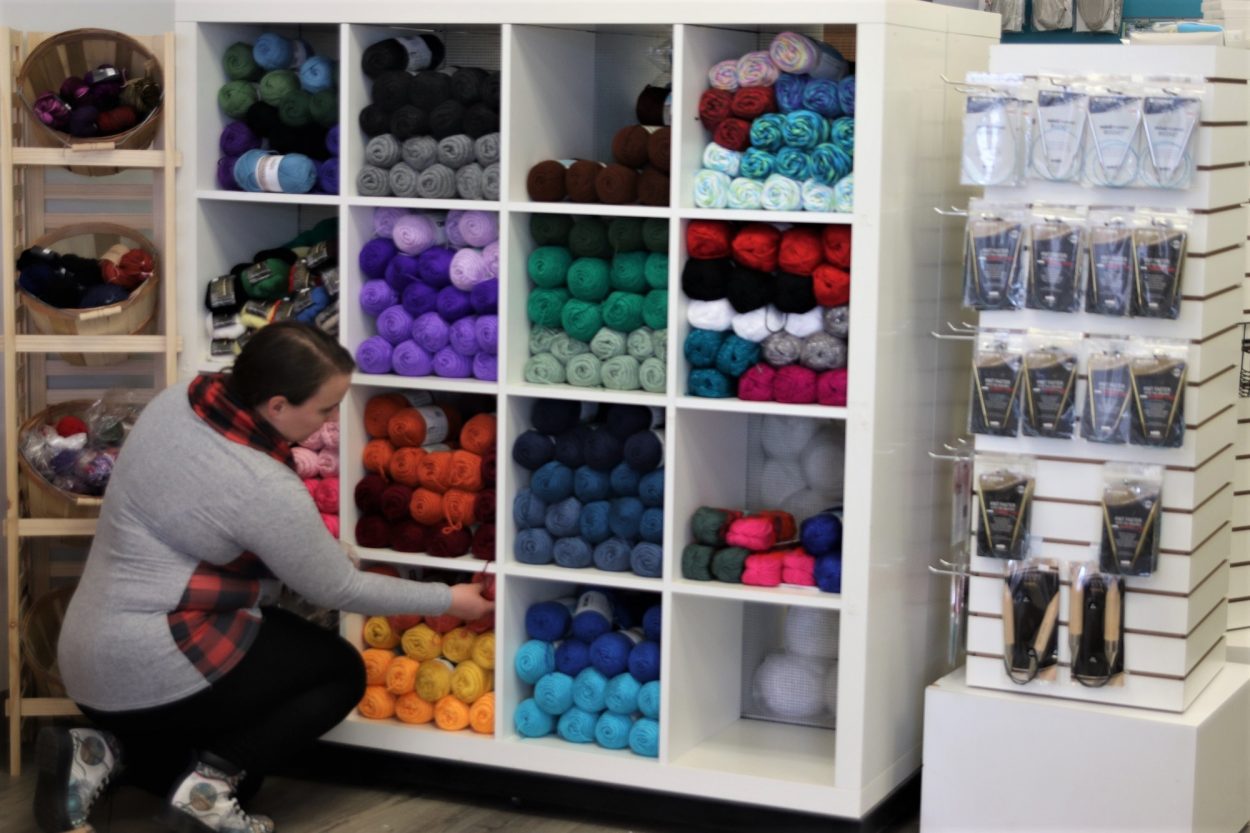 Leslie Dupuis stocks yarn in anticipation of this week’s opening. She decided to open Raven’s Hook to help local crafters and to supply her own crochet business. (KCAW photo/Erin McKinstry)