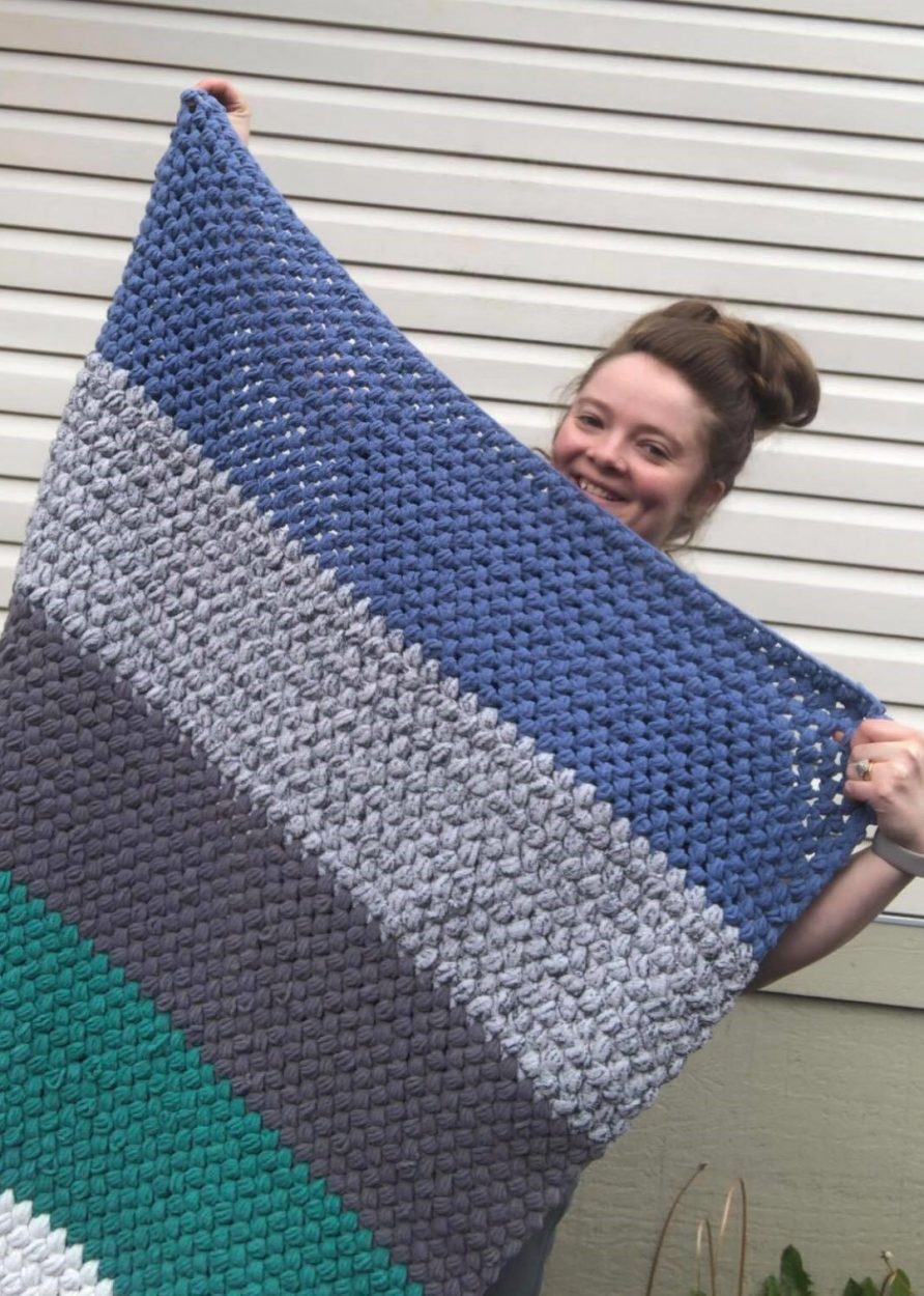 Sydney-Jane Armstrong holds up one of her crocheted blankets. She just started selling them and is excited to have a local supplier for her crochet business. (Sydney-Jane Armstrong photo)