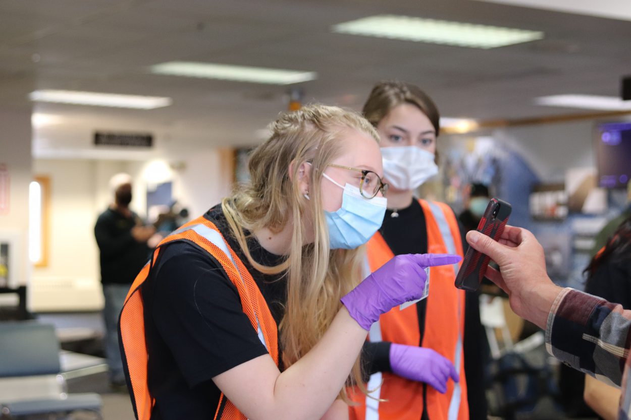 Allen Marine employee Tori Shoemaker checks a traveler’s COVID test results on their cell phone at Sitka Rocky Gutierrez Airport. She attends University of Alaska Southeast and normally works as a lifeguard during the summer. (Erin McKinstry, KCAW / June 2020)