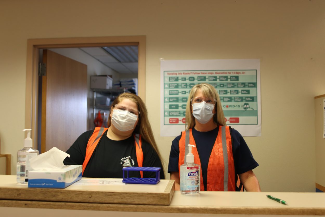 Allen Marine employees Rebecca Linn (left) and Shelley Gillaspey (right) help passengers self-test for coronavirus. Gillaspey normally works as the school nurse for Sitka School District. (Erin McKinstry, KCAW / June 2020)